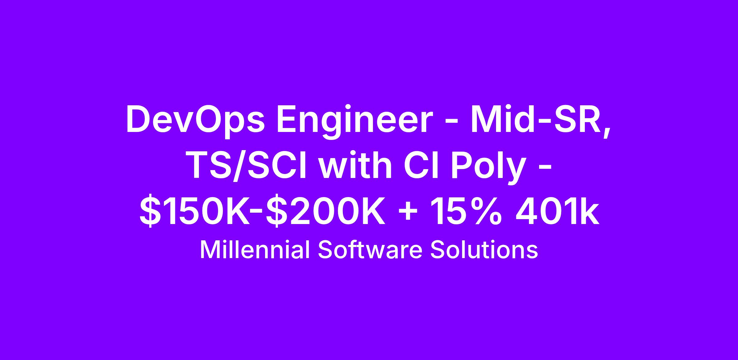 Millennial Software is seeking a DevOps Software Engineer to join our team. You will be working closely with a talented team to deliver a complex software application into operations. In addition, you'll have the opportunity to grow and hone your skills with other talented members at Millennial Software. Our ideal candidate is a DevSecOps Engineer who is a hard charging self-starter that can come onto a team and begin to produce quickly. You should have a strong understanding of IaC, containerization, automated test, and deployment pipelines to evolve our existing software infrastructure and architecture.