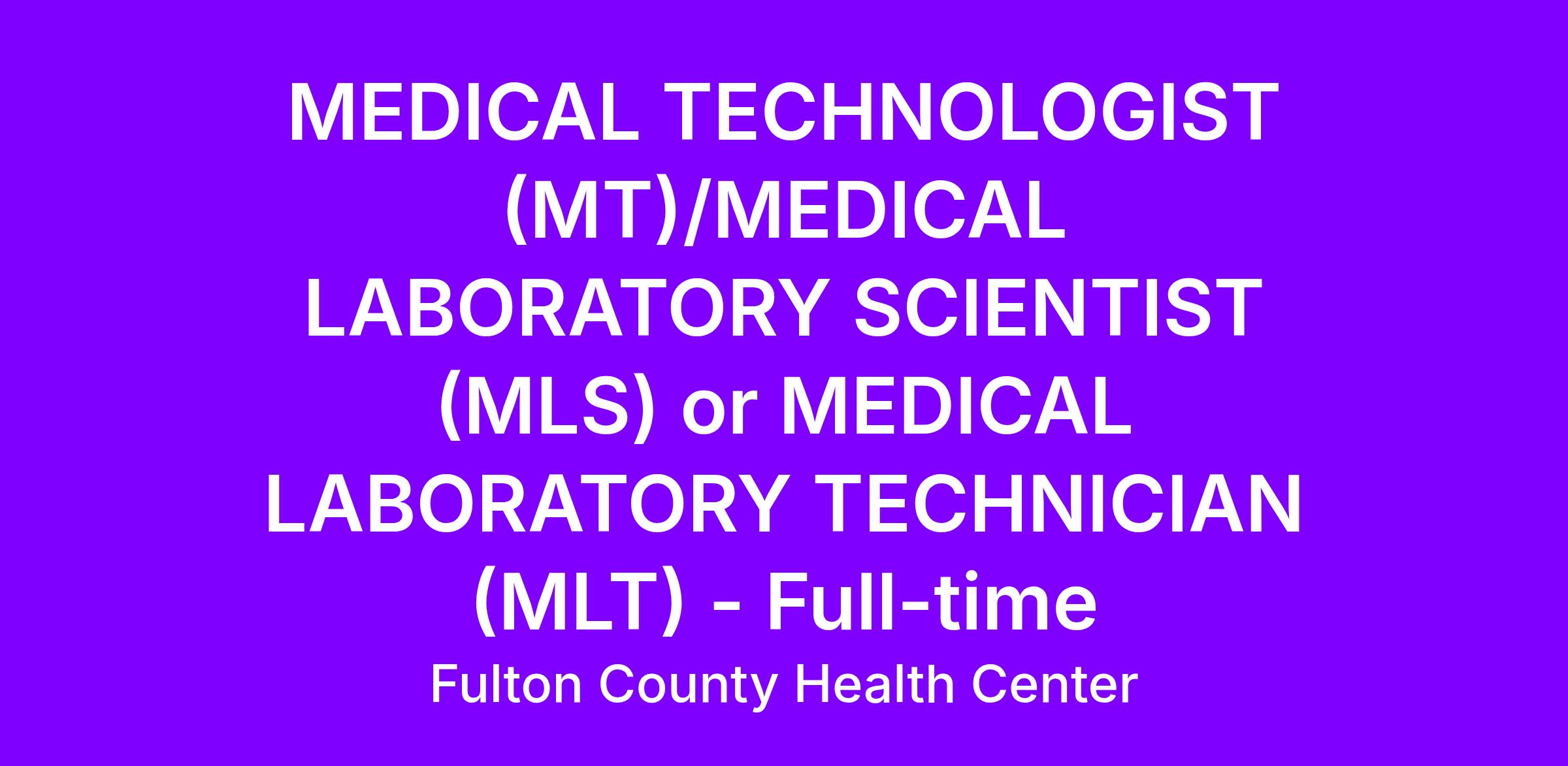 Fulton County Health Center is seeking a skilled and dedicated Medical Technologist (MT)/Medical Laboratory Scientist (MLS) or Medical Laboratory Technician (MLT) to join our laboratory team on a full-time basis. This role involves conducting a variety of laboratory procedures essential for the diagnosis and treatment of disease, reporting results to ordering providers, and consulting with providers regarding test results.