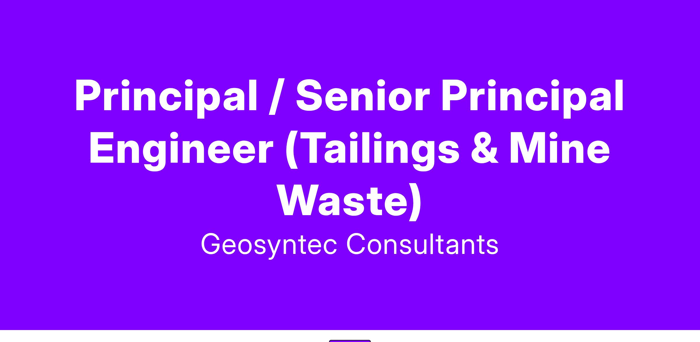 Geosyntec is seeking a highly experienced Principal or Senior Principal Geotechnical Engineer to join and continue to grow our North America Mining & Tailings Practice from Calgary, AB, reporting to our Waterloo, ON operations. A remote work schedule may be available at the Company’s discretion. The ideal candidate for this position will have an entrepreneurial attitude, be enthusiastic, and lead business development and technical efforts focused on providing strategic solutions to our client’s most complex problems. This position will support the development and implementation of new strategies to expand Geosyntec’s team, reputation and market share within the Geotechnical Practice.