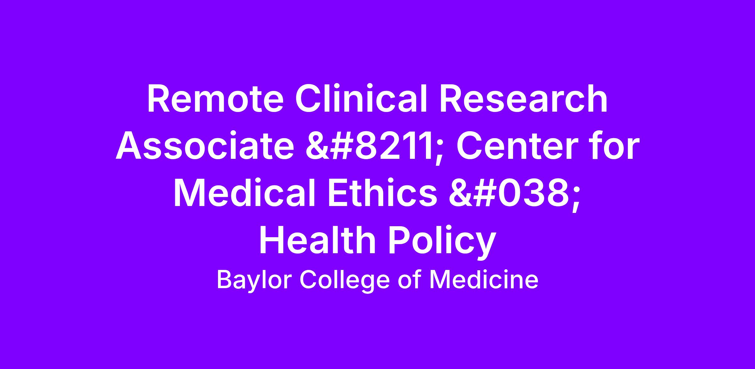 The Center for Medical Ethics and Health Policy at Baylor College of Medicine is seeking Clinical Research Associate for a role focused on projects integrating AI tools into clinical care.