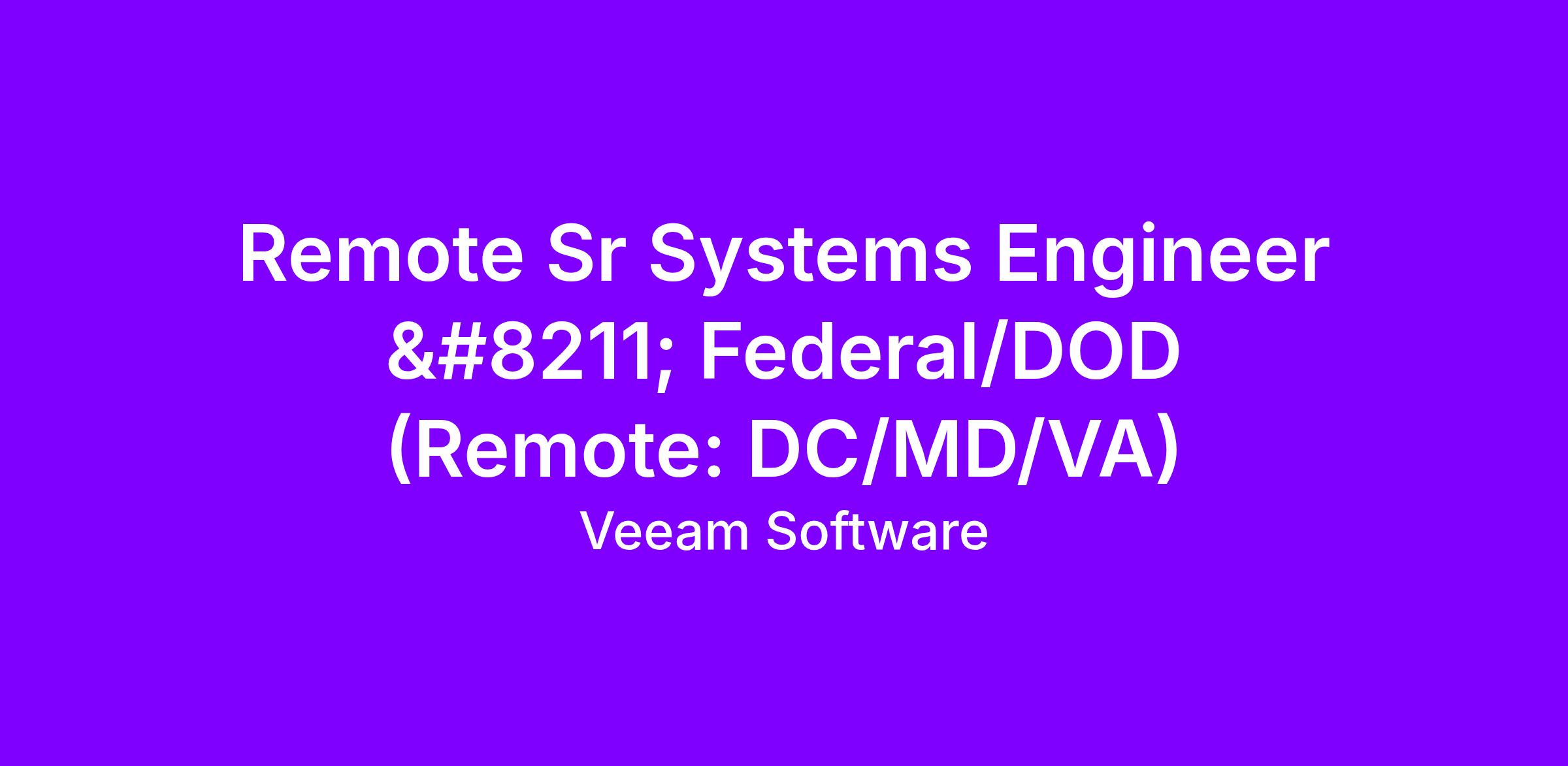 The Sr. Systems Engineer is responsible for working closely with the federal sales department and engineering management to help inform, educate and influence partners, resellers and end users of our product offerings. Responsibilities excellent presentation skills and present Veeam messaging to varying numbers and levels of decision makers within DoD. You will be responsible for the creation of content and delivery of demonstrations to support Veeam Federal messaging. The successful candidate will be a self-motivated, technically competent Veeam Systems Engineer with an ability to partner with other groups within the sales and support organization to close sales. The role requires strengths and a background in defining architectural strategies to guide customers toward the adoption of Veeam technologies.