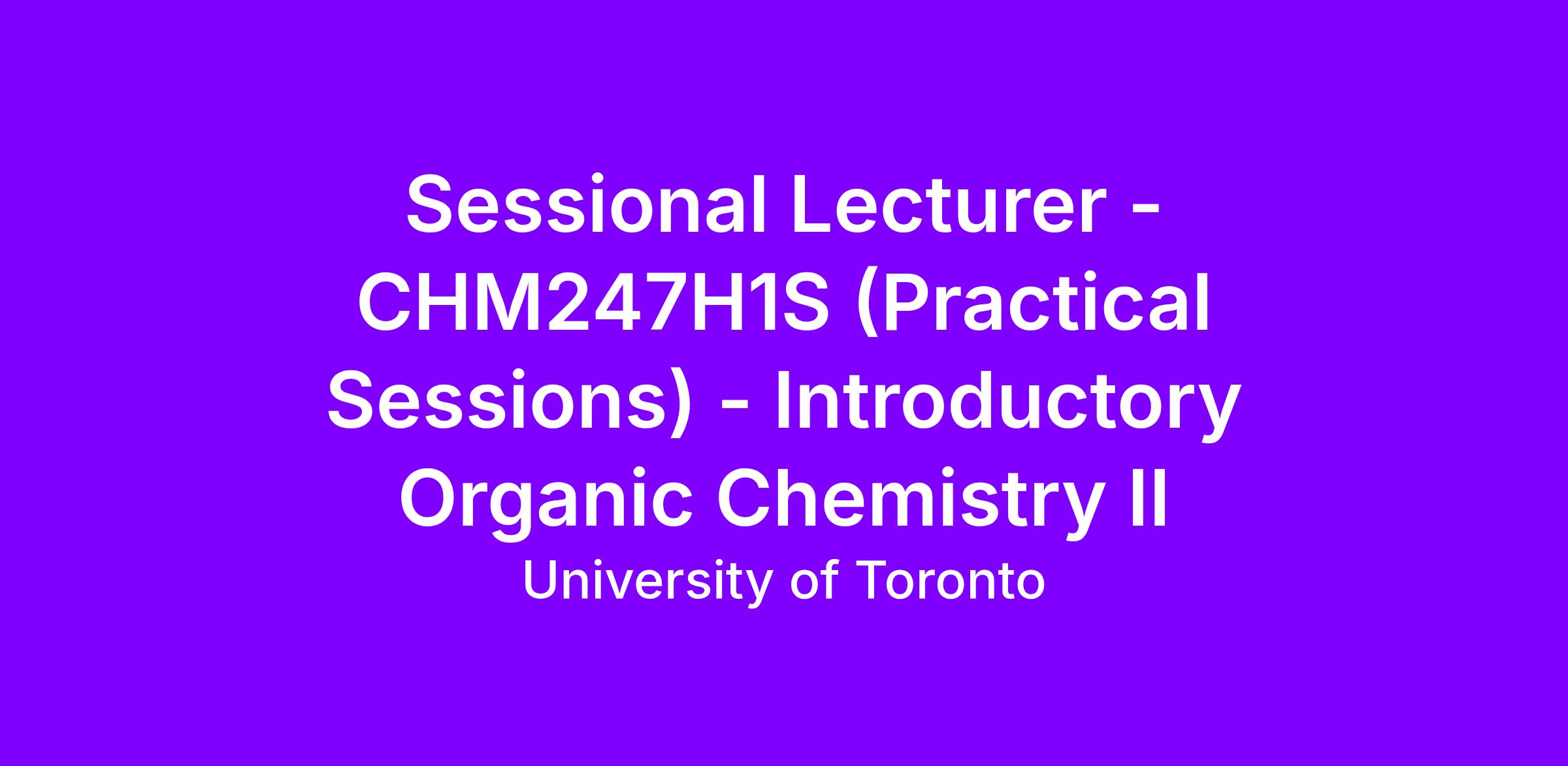 Description of Duties: The Department of Chemistry requires a sessional lecturer to deliver the in-person laboratories in CHM247H1 (Introductory Organic Chemistry II) during the 2026 Summer session. Duties include the responsibility of effectively coordinating labs with all of the attendant organizational issues of laboratory preparation and delivery, supervision of lab demonstrators (teaching assistants), facilitating and marking laboratory tests and exams, submission of final laboratory grades, and holding office hours.